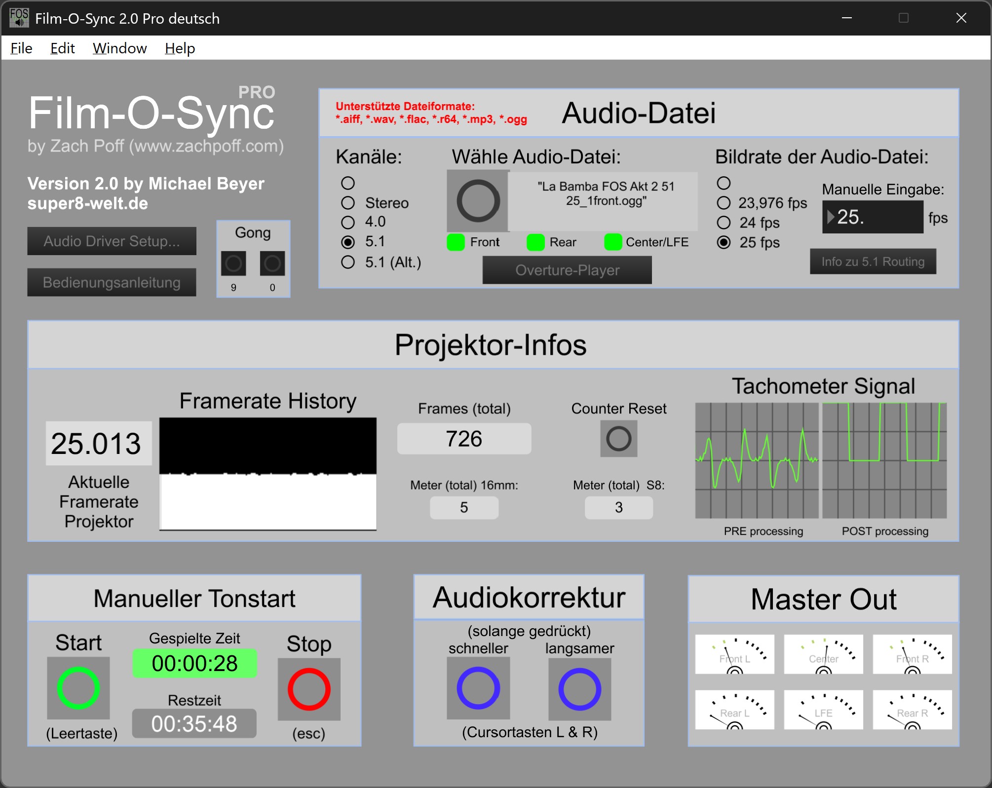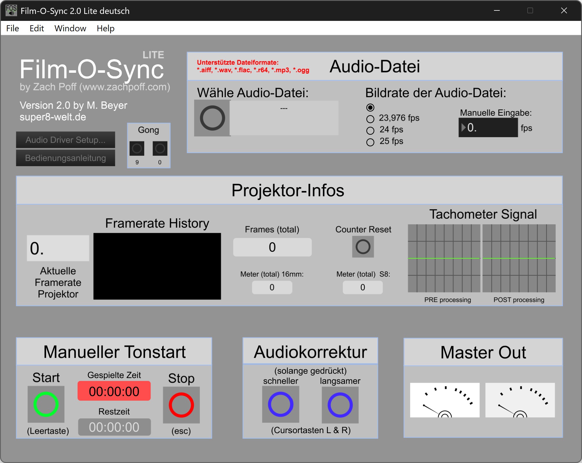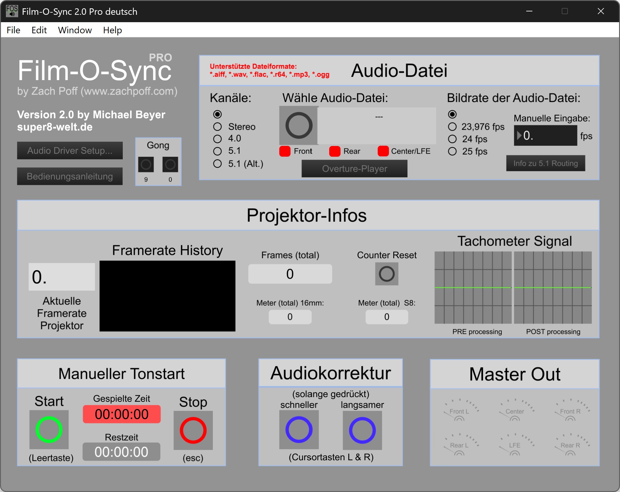 Da im Laufe meiner Tests eine Menge Schwachpunkte und auch Fehler aufgetaucht sind, habe ich mir die Software vorgenommen, diese Dinge beseitigt und sozusagen auf meine Bedürfnisse angepasst. Allerdings läuft Film-O-Sync 2.0 jetzt nur noch unter Windows ab Version 10. Es gibt eine deutsche und eine englische Version. Optisch habe ich nicht besonders viel verändert. Ich habe mich mehr um den Funktionsumfang, Genauigkeit und Stabilität gekümmert. Je nachdem, welche Ansprüche ihr habt, gibt es jetzt 2 verschiedene Versionen: Lite und Pro. Auf die Unterschiede gehe ich weiter unten ein.