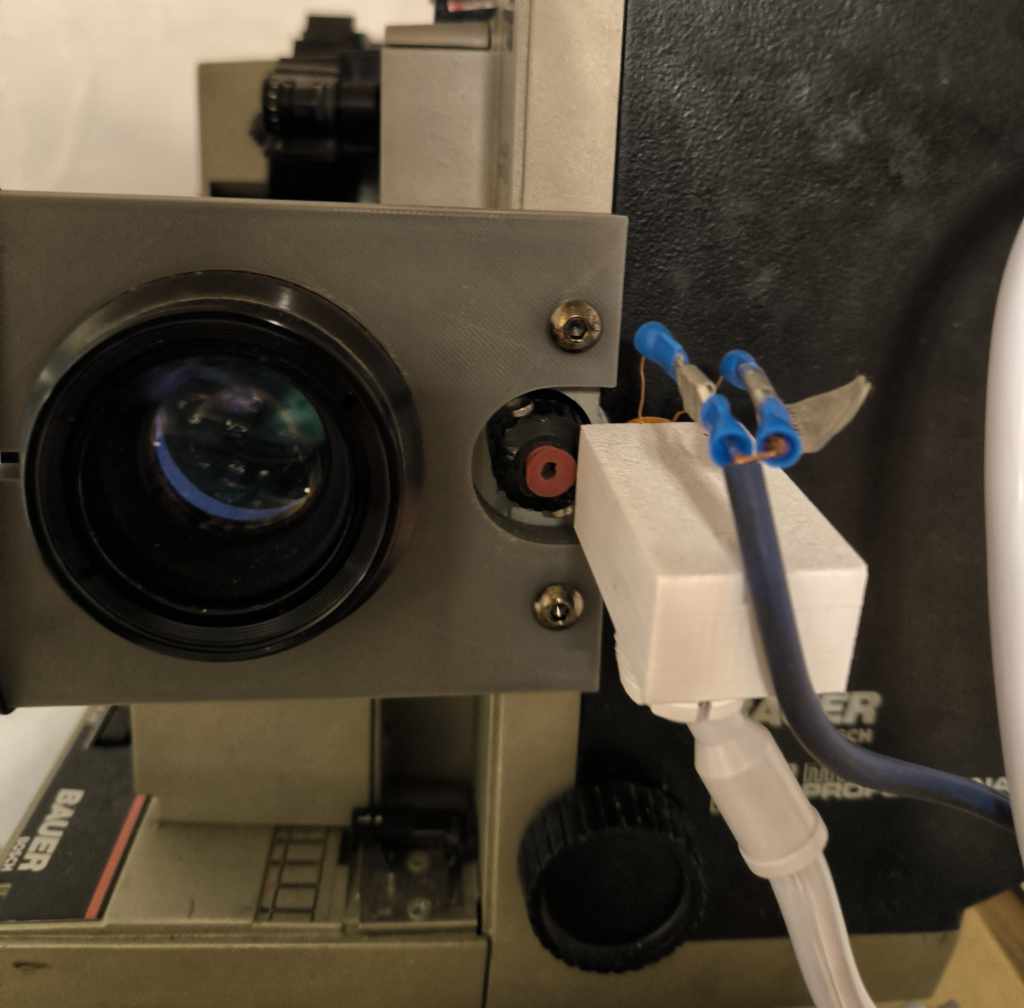 Hierfür sind – je nach Projektormodell – eventuell kleinere Umbauten notwendig. Wie ich es bei meinen Bauer 16mm-Modellen gemacht habe, erkläre ich etwas weiter unten. Zach Poff zeigt hier, wie er es im Innern seines Elmo 16 CL realisiert hat. Kostenmäßig liegt das erforderliche Material unter 10 Euro.
